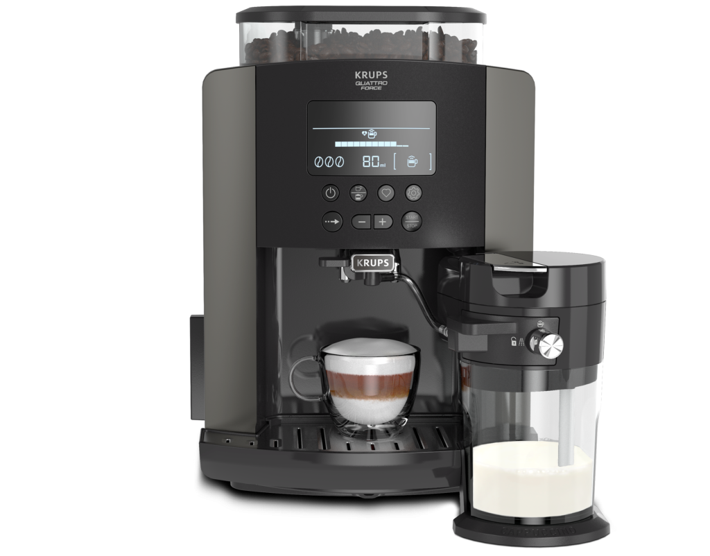 Espressorul automat Krups Arabica Latte asigură rezultate de înaltă calitate pentru toate băuturile tale preferate pe bază de cafea, de la ristretto până la cappuccino irezistibil. Recipientul pentru lapte te ajută să obții un cappuccino perfect. Ecranul LCD asigură o utilizare ușoară și intuitivă pentru o preparare rapidă. Sistemul Krups Quattro Force garantează o savoare excepțională datorită tehnologiei proiectată special pentru râșnire optimă, presare perfectă a boabelor de cafea, infuzare și autocurățare.